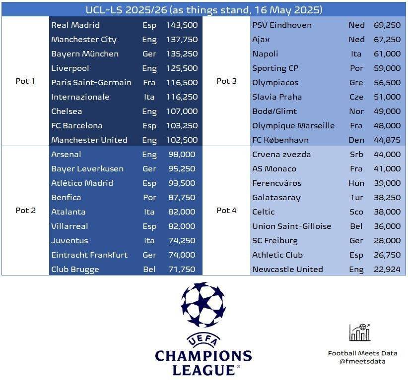 直播吧05月16日讯 今日足球数据媒体Football Meets Data更新了截止至今日,下赛季欧冠的分档情况。